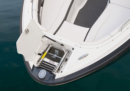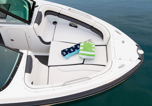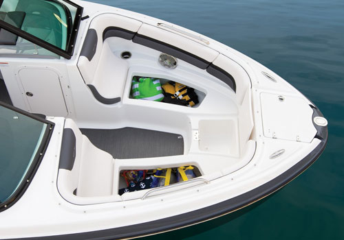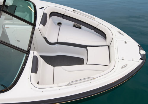 Chaparral makes anchor storage easy thanks to a dedicated compartment complete with a cradle and room for a line and chain. The forward compartment also houses a ladder that makes re-entry from any beach super easy. Additionally, the forward bow cushion can be removed, creating a huge non-skid step during high traffic boarding. Upfront you'll enjoy adult-sized legroom and reassuring freeboard. Carry-ons stow under the seat cushions with molded drainage channels that help route water away from the storage areas. Plush tri-tone upholstery showcases detailed stitch work. |