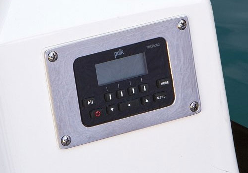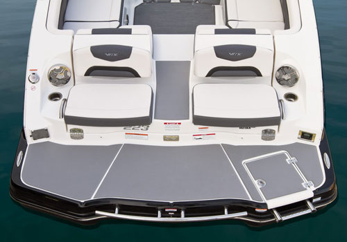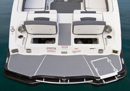 Irresistibly fun, the swim platform may prove the busiest place onboard the 223 VRX. A three step telescopic ladder stows in its own hideaway compartment and makes it easy from the water back onboard. A standard protective mat provides sure-footing. A rubrail encases the platform, providing an extra measure of protection. Twin aft facing seats with grab handles feature handy storage underneath. Recessed stereo speakers are perfectly positioned because let's face it, the party is usually in the water. |