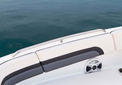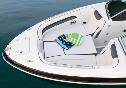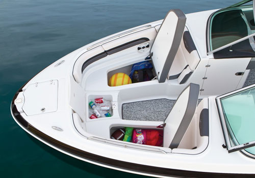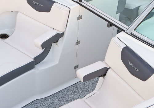 | A must-have for rafting parties, the anchor stows in its own cradle inside a dedicated compartment that has room for a line and chain and a forward ladder. The biggest bow area in our Vortex Series features recessed stereo speakers and stainless steel drink holders. The huge bow area offers adult-sized legroom, storage under the seats and reassuring freeboard. A plush filler cushion is standard and transforms the bow to a place to recline and let the sun work its magic. A standard weather door guards against wind in the cockpit on chilly mornings or late in the boating season. |