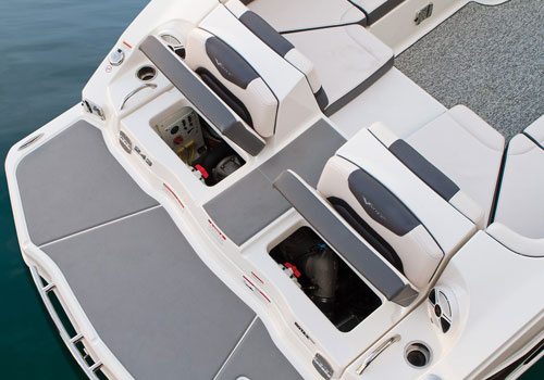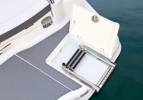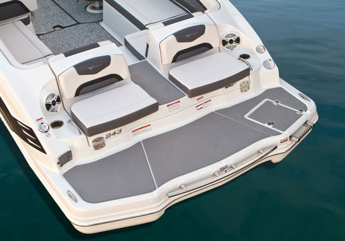 | Feel free to get a little wild. The 243's swim platform is the perfect launching pad for all kinds of watersports. A three step telescopic ladder stows in its own hideaway compartment, not atop the platform robbing valuable space. A standard protective mat provides sure-footing. Twin aft facing seats feature grab handles within arm's reach and stainless drink holders. Recessed stereo speakers beside each seat are the perfect in-the-water party starter. |